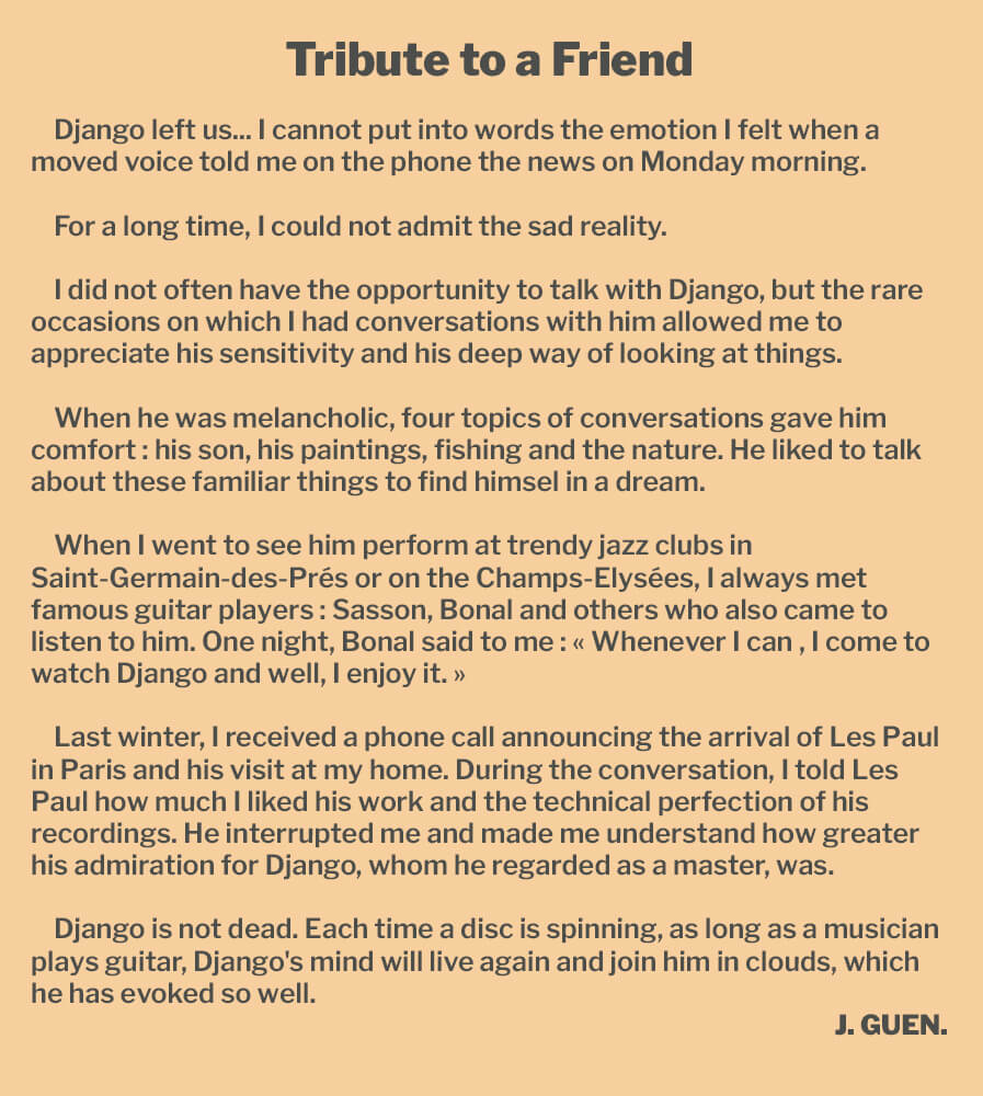 Around the same period, the French guitarists Jean Bonal, Marcel Bianchi, Jean-Pierre Sasson and Henri Crolla adopted Stimer pickups and amplifiers. During his stay in Paris in the late 1952, the American guitarist Les Paul payed a visit to Jean in his workshop : « Les Paul came with Django. He and Mary Ford, his wife, bought me two pickups and one amplifier. Then, I drove them to the Bourget Airport. They were scheduled to perfom that evening at the London Palladium. It happened quickly. When I told this story to the Jazz Hot magazine, they said : "You're out of you mind ?! Les Paul and Django who came to your home, that would have made a terrific publicity !" I had not thought about that, I wasn't a typical trader. » Later, other musicians like Roger Chaput or Django's brother Joseph Reinhardt called upon the Établissements Guen Frères to provide them amplification equipment.